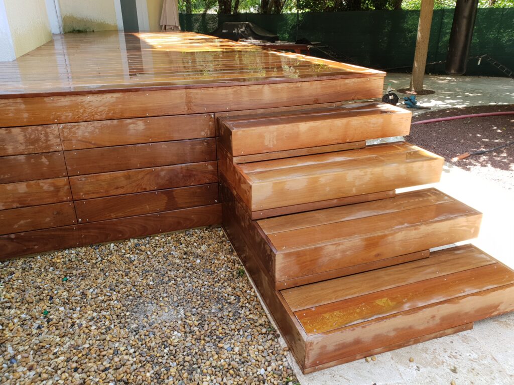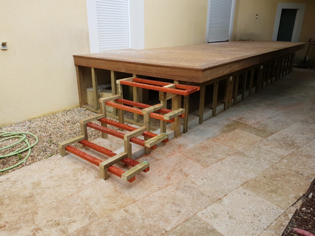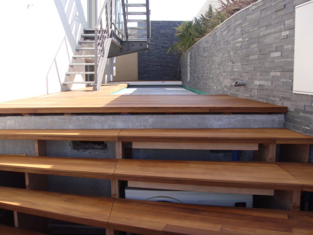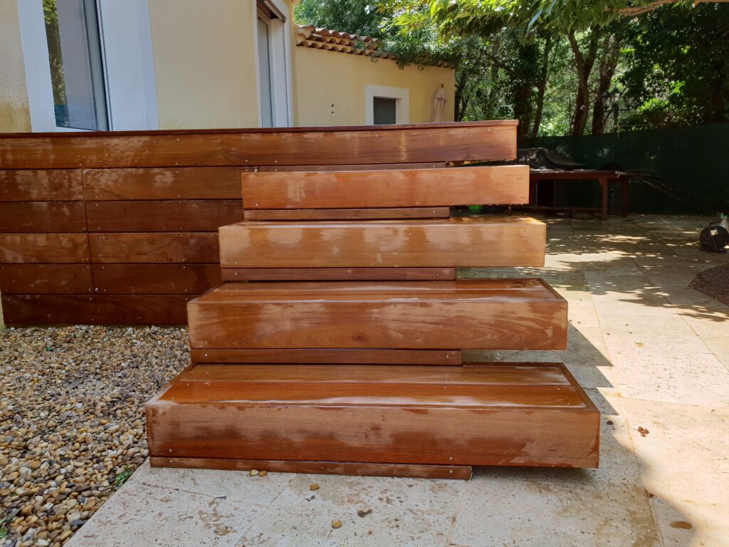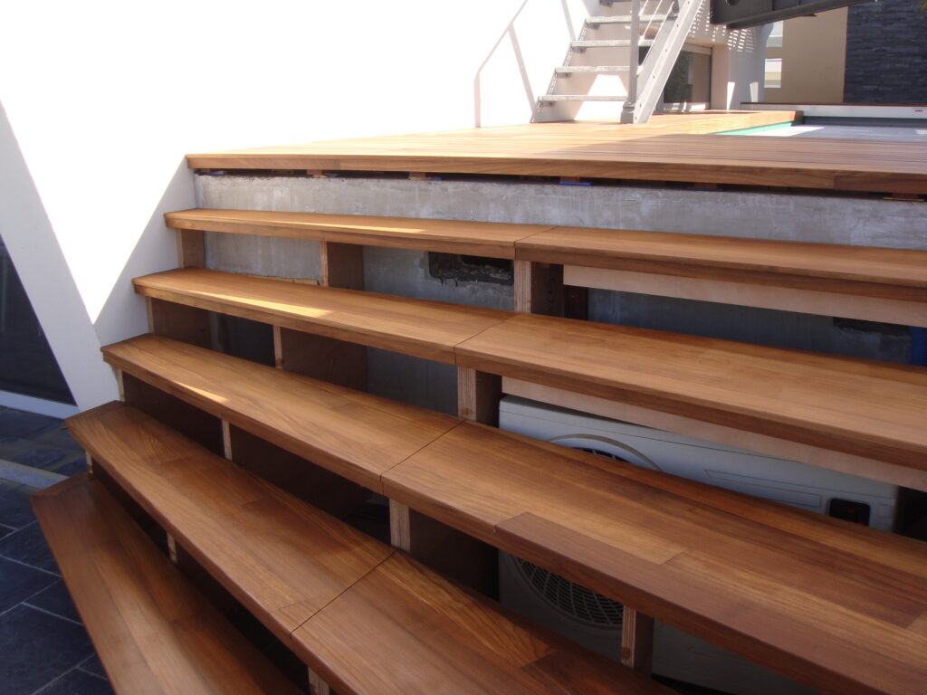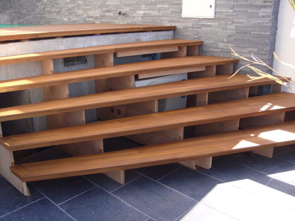 Un escalier en teck demande précision et savoir-faire. Chaque marche a été taillée et ajustée avec soin pour garantir un bon alignement tout en respectant les normes de sécurité.
