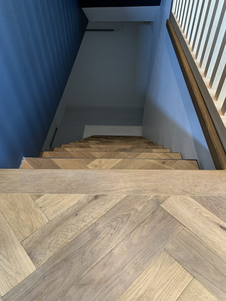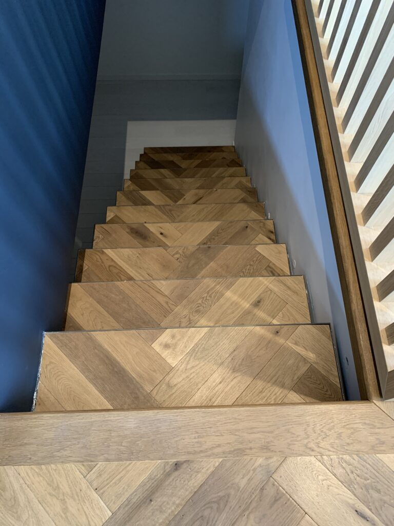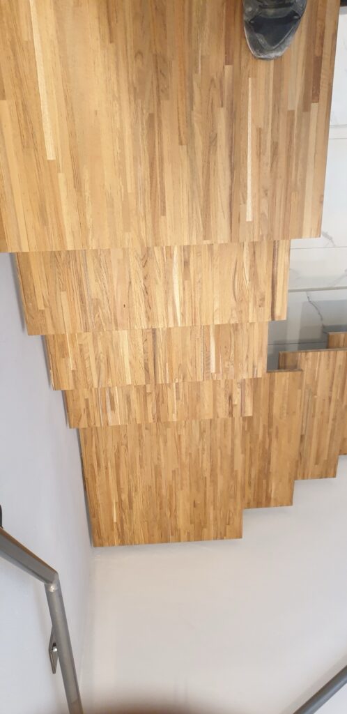 Toutes les marches sont mises en place avec minutie. En raison de sa densité, l’Iroko nécessite une attention particulière lors de la pose afin d’obtenir un alignement optimal et une stabilité durable.